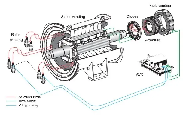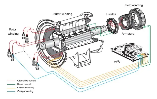 The power supply to the AVR power circuit is independent from the voltage sensing measured on the alternator output terminals.