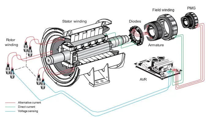In PMG excitation systems, the AVR power supply voltage is generated by a permanent magnet generator (PMG) that is mounted on the shaft extension at the nondrive end of the alternator. The PMG delivers a constant voltage, regardless of the main alternator winding. PMG systems have high overload and short circuit (for LSA range: 300% - 10 s) capacities.